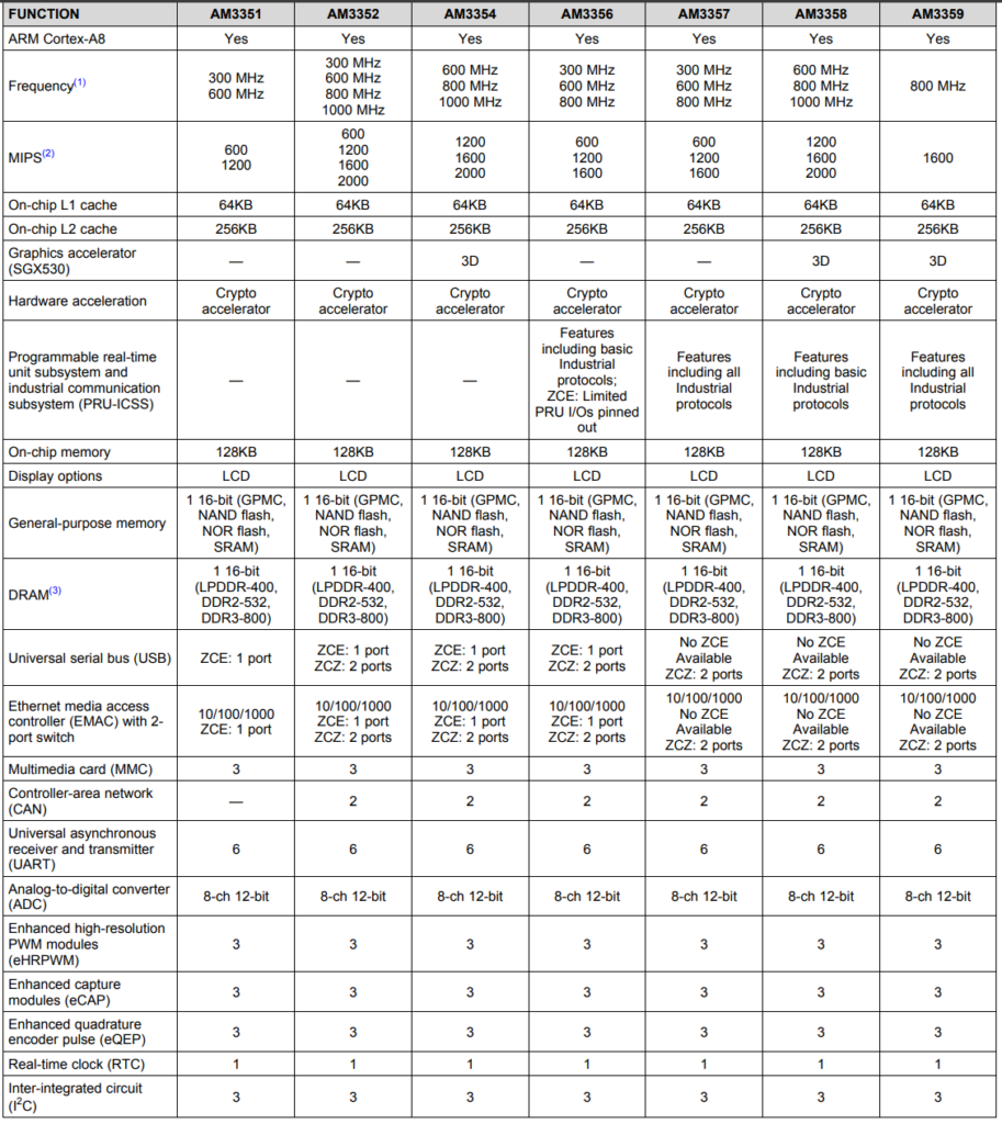 По отличиям плат от оригинального BeagleBone Black — самые значимые: SoC, RAM, и NAND. С RAM и NAND писал выше, а с SoC хорошо бы уточнить в даташите по различиям между AM3352 и AM3358. Смотрим: