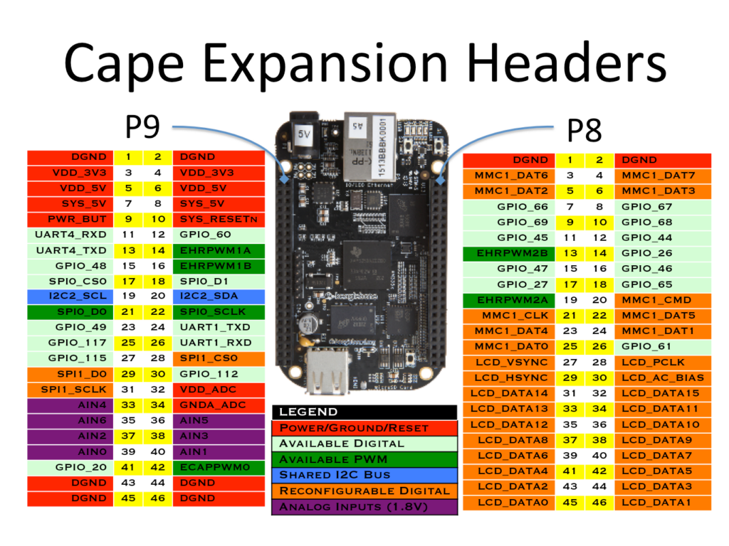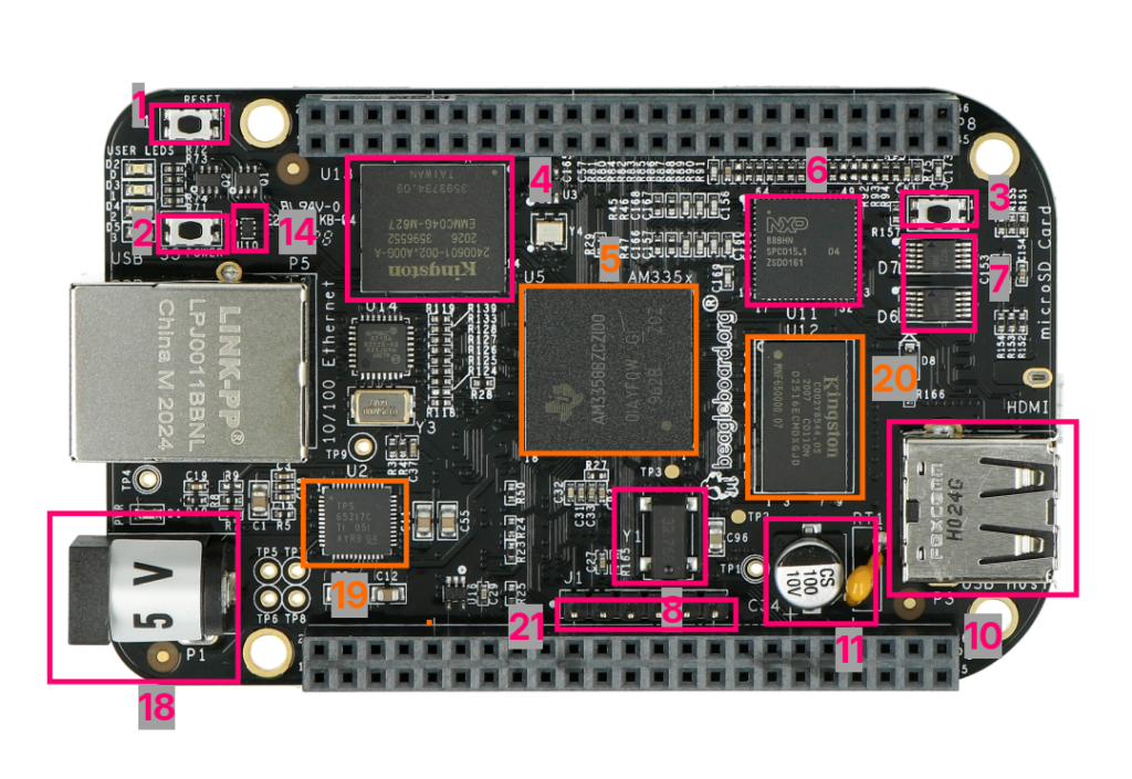 Для начала пару слов о том, что такое вообще эти BeagleBone (если ответ вам известен — переходите к следующему разделу). Как было сказано выше — это серия devboards (плат разработчика) с SoC семейства AM335x от Texas Instruments. Основные BeagleBone — это Black и Green. Есть еще Red и White (она же первая и оригинальная в этой линейке). И еще есть Blue и AI, но у них другой SoC. Самая популярная из этих плат — Black, рассмотрим её характеристики: