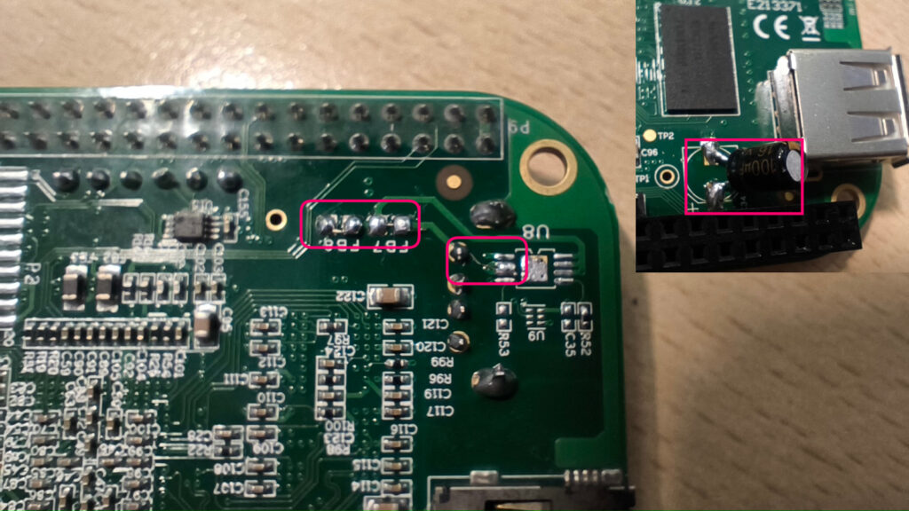 -USB: Разъем можно запаять, если лень подпаиваться (он типовой, USBA-1J например подойдет, на фото выше как видите уже запаял его). Защиту и обвязку защиты можно не распаивать (она не в разрыве, а параллельно). Резистор R52 (10K 0603) по желанию можно распаять, чтобы убрать сообщения over-current condition (можно сдернуть R46 с нижней платы-основы буретброда), а можно и не распаивать — сообщение на работу не влияет. Электролит по питанию (С34, №11 обведен на фото) очень желательно распаять (6.3-16В/100-330uF). Предохранители FB7 и FB8 надо распаять перемычками (иначе PHY подумает что нет питания, и USB не будет работать), также вместо ключа по питанию надо поставить перемычку: