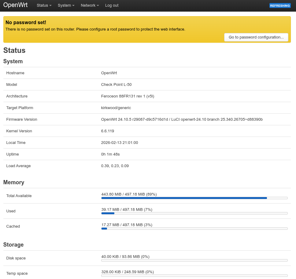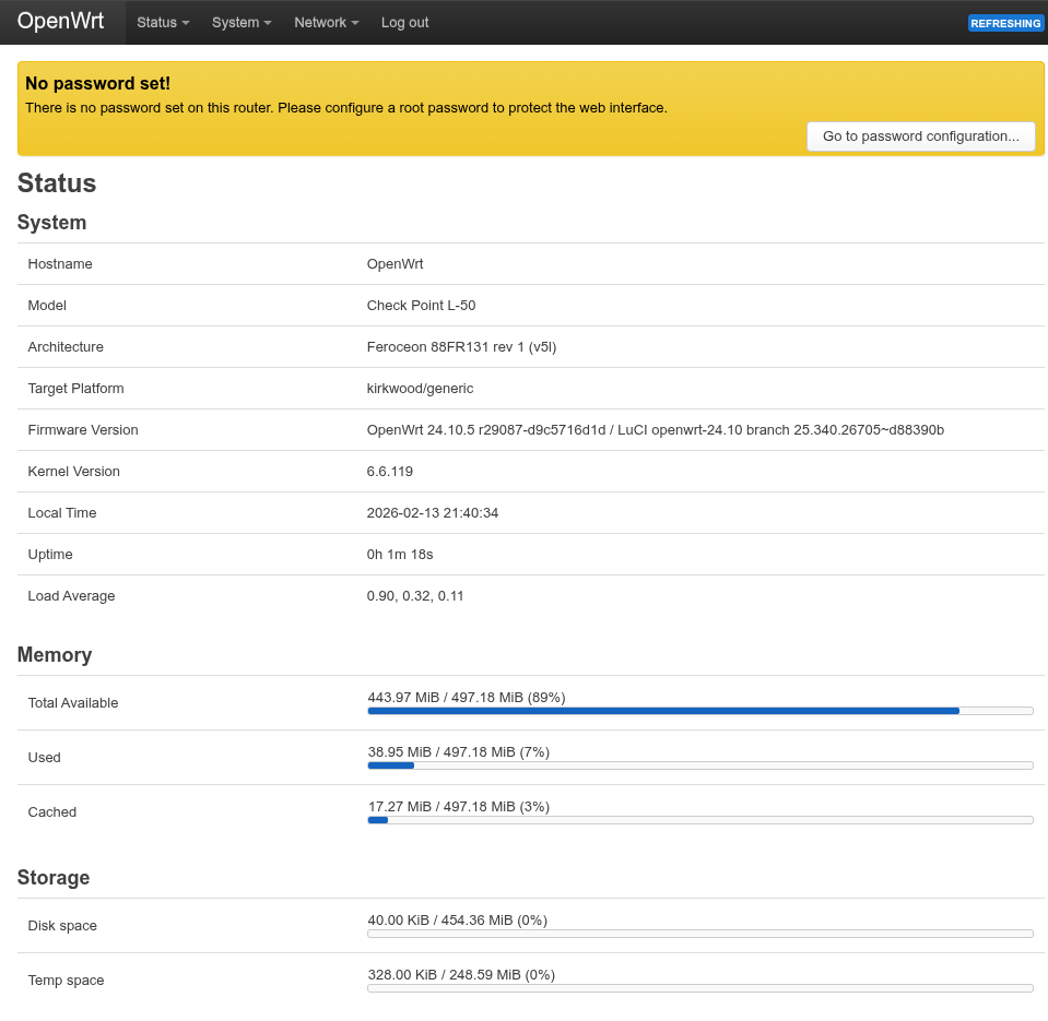 Все ок. Идем в веб интерфейс (или в консоль), и снова прошиваем openwrt-24.10.5-kirkwood-generic-checkpoint_l-50-squashfs-sysupgrade.bin (без Keep settings).