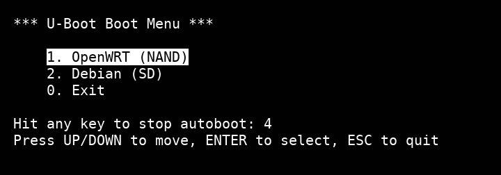 -Дуалбут с OpenWRT: Звучит сложно, но bootmenu - это штатная плюшка u-boot. Конечно же OpenWRTшники её в своем u-boot тоже не включили, но у нас же уже сорцы нового u-boot - так что включаем bootmenu в конфиге u-boot и пересобираем. Настраиваем u-boot envs для bootmenu, и итог - OpenWRT стоит на NAND, Debian на SD/USB , красивая менюшка появляется при старте девайса.